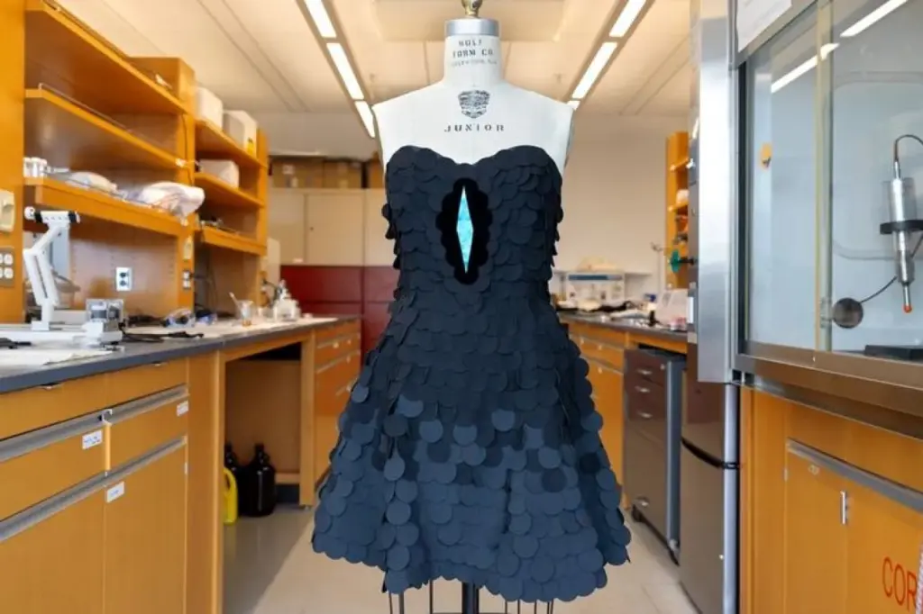 Tim Cornell bahkan telah mendemonstrasikan potensi ini dengan menciptakan sebuah gaun hitam dramatis yang dihiasi panel biru iridesen, terinspirasi langsung dari keindahan toowa cemerlang.