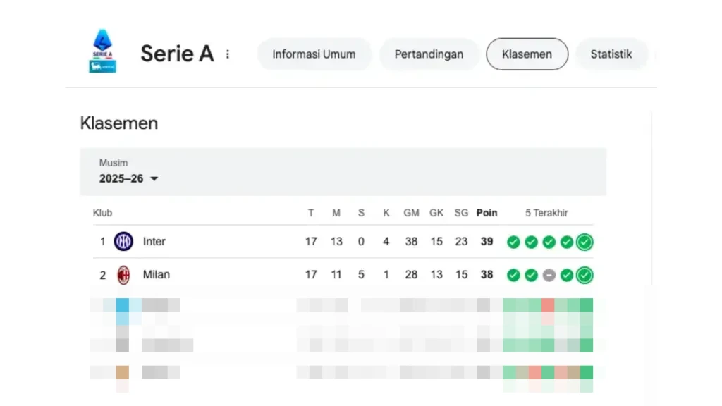 Klasemen Sementara Liga Italia Serie A